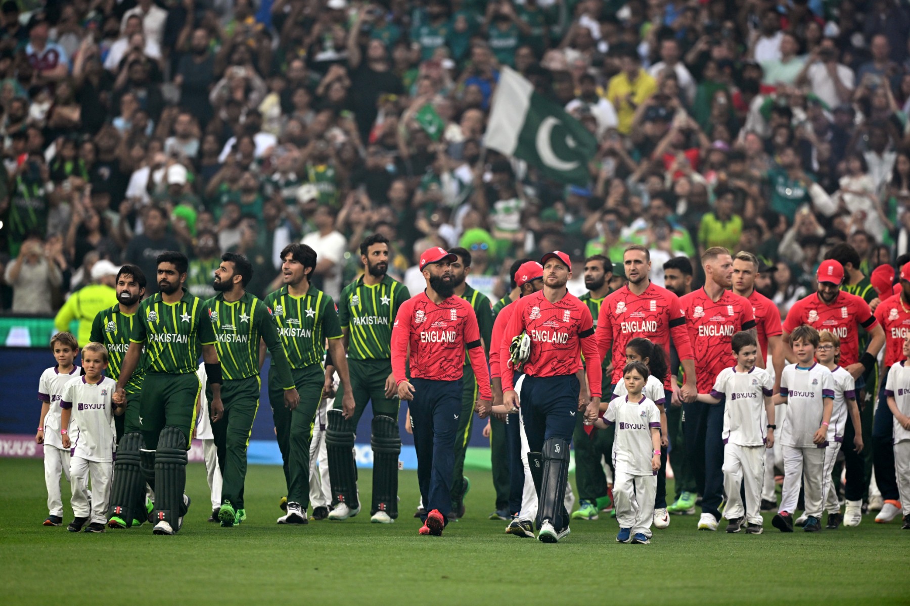 <p class="rteright">13 نومبر 2022، میلبرن کرکٹ گراؤنڈ میں پاکستان اور انگلینڈ کی ٹیموں کے درمیان ٹی ٹوئنٹی میچ سے قبل کھلاڑی میدان میں اترتے ہوئے(اے ایف پی/ولیم ویسٹ)</p>