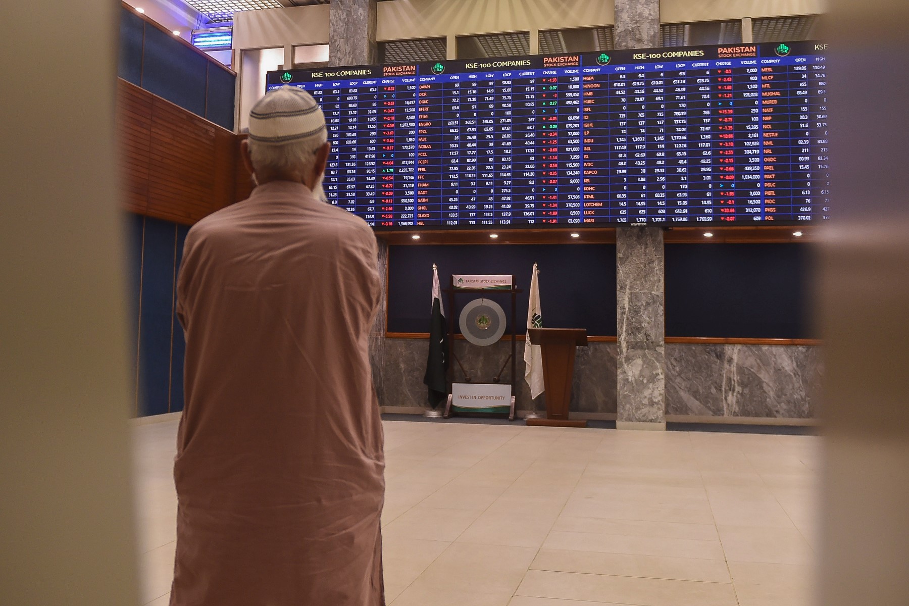 <p>ایک سٹاک بروکر چار اپریل 2022 کو کراچی میں ٹریڈنگ سیشن کے دوران (رضوان تبسم / اے ایف پی)</p>