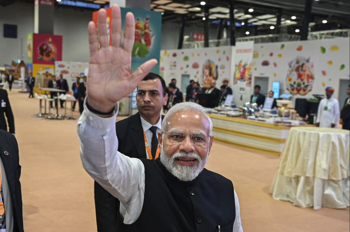 <p>انڈین وزیر اعظم نریندر مودی 10 ستمبر 2023 کو نئی دہلی میں جی 20 سربراہی اجلاس کے مقام پر بین الاقوامی میڈیا سنٹر کے دورے کے دوران (اے ایف پی)</p>
