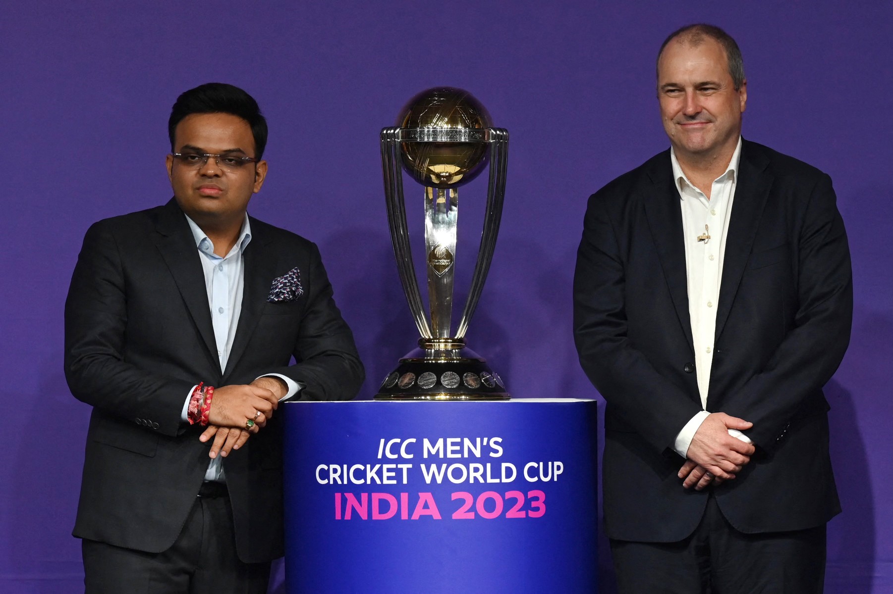 <p>بی سی سی آئی کے سیکرٹری جے شاہ اور آئی سی سی کے چیف ایگزیکٹیو جیف ایلارڈائس 27 جون، 2023 کو ممبئی میں (اندرانیل مکھرجی/ اے ایف پی)</p>