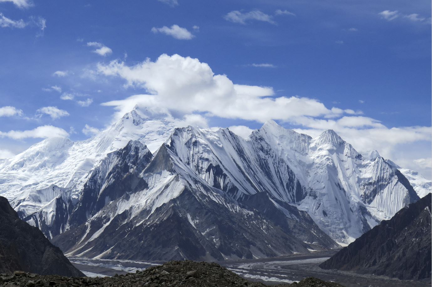 <p>15 اگست 2019 کی اس تصویر میں پاکستان کے شمالی علاقے گلگت میں قراقرم کے پہاڑی سلسلے میں واقع برف پوش پہاڑوں اور گلیشیئرز کا منظر دیکھا جا سکتا ہے (ایملی ہیرنسٹین /اے ایف پی)</p>