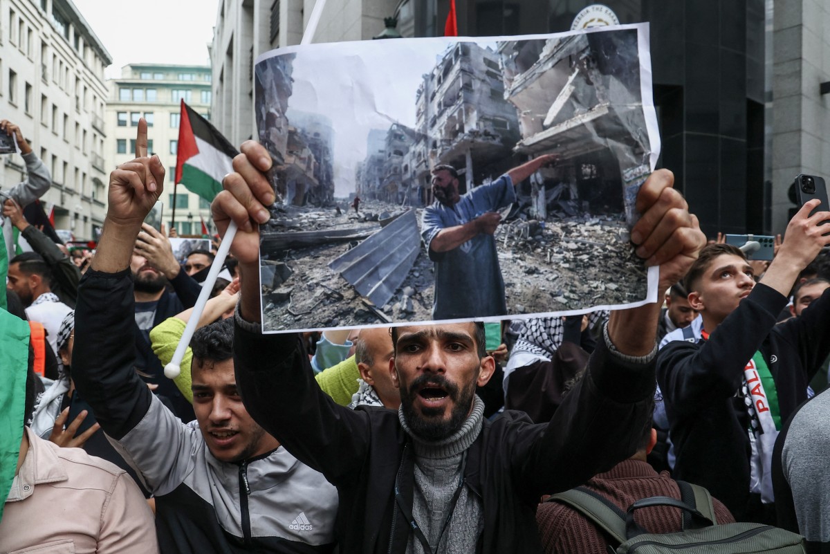 <p>11 اکتوبر 2023 کو برسلز میں غزہ میں اسرائیل کی فوجی کارروائیوں کے خلاف اور فلسطینیوں کی حمایت میں ایک مظاہرے کے دوران ایک شخص نے اے ایف پی کے فوٹوگرافر محمود حمس کی لی گئی تصویر اپنے سر کے اوپر اٹھا رکھی ہے (اے ایف پی/ کینزو ٹریبولارڈ)</p>