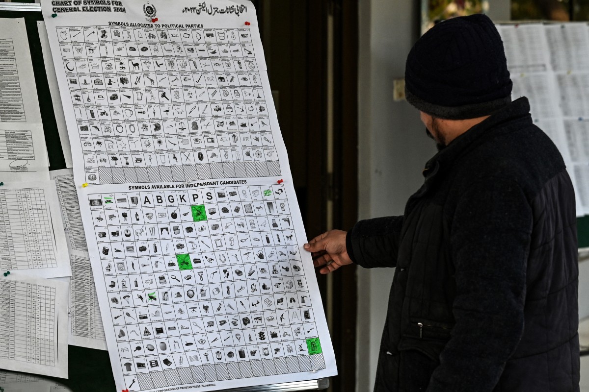 <p>پاکستان کے آئندہ عام انتخابات سے قبل 15 جنوری، 2024 کو راولپنڈی میں انتخابی دفتر میں آویزاں سیاسی جماعتوں اور آزاد امیدواروں کے انتخابی نشانات پر مشتمل ایک چارٹ کو ایک شخص دیکھ رہا ہے (اے ایف پی)</p>