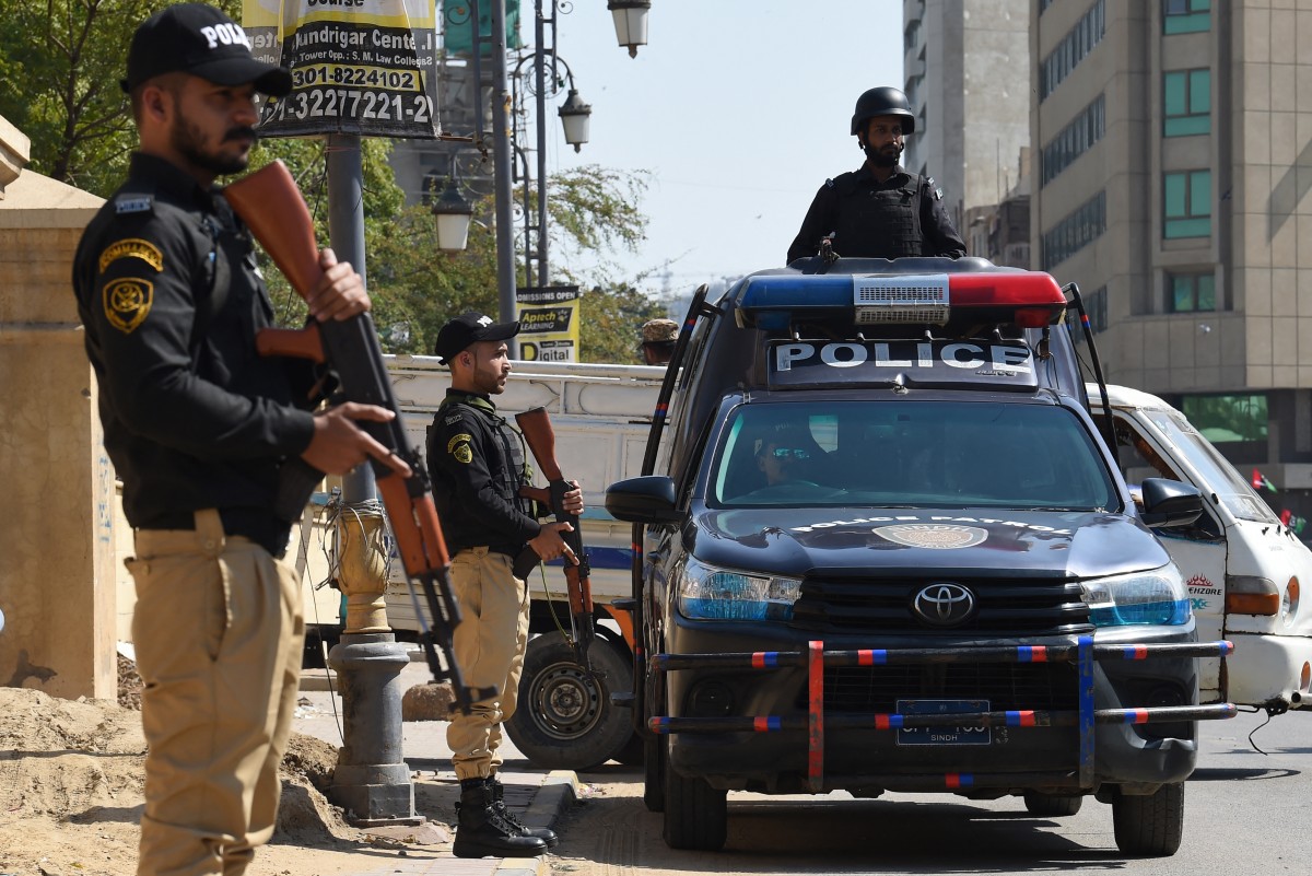 <p>آٹھ فروری، 2024 کو کراچی میں ایک عمارت کے باہر پولیس پہرہ (آصف حسن/ اے ایف پی)</p>
