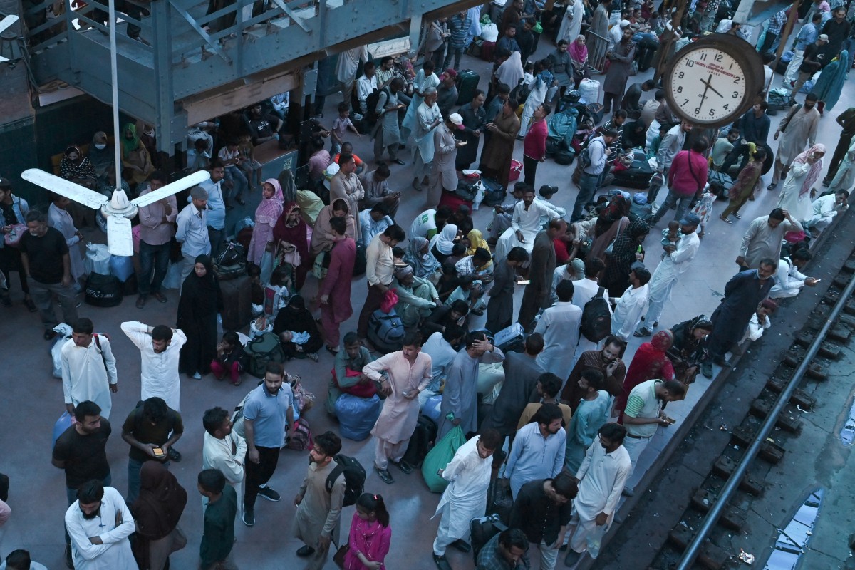 <p>آٹھ اپریل 2024 کو لاہور ریلوے سٹیشن پر مسافر (عارف علی/ اے ایف پی)</p>