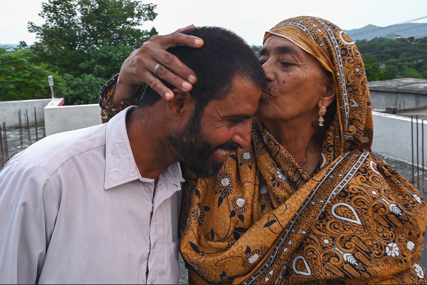 <p>17 جولائی 2023 کی اس تصویر میں پاکستانی کارکن محمد نعیم بٹ کو ان کی والدہ رضیہ لطیف کھوئی رٹہ میں اپنے گھر پر بوسہ دے رہی ہیں (اے ایف پی)</p>
