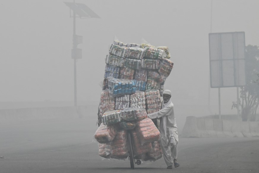 <p>آٹھ نومبر 2024 کی اس تصویر میں لاہور میں سموگ میں گھری سڑک پر ایک مزدور اپنی سائیکل پر کھانے پینے کی اشیا لے جا رہا ہے (عارف علی / اے ایف پی)</p>