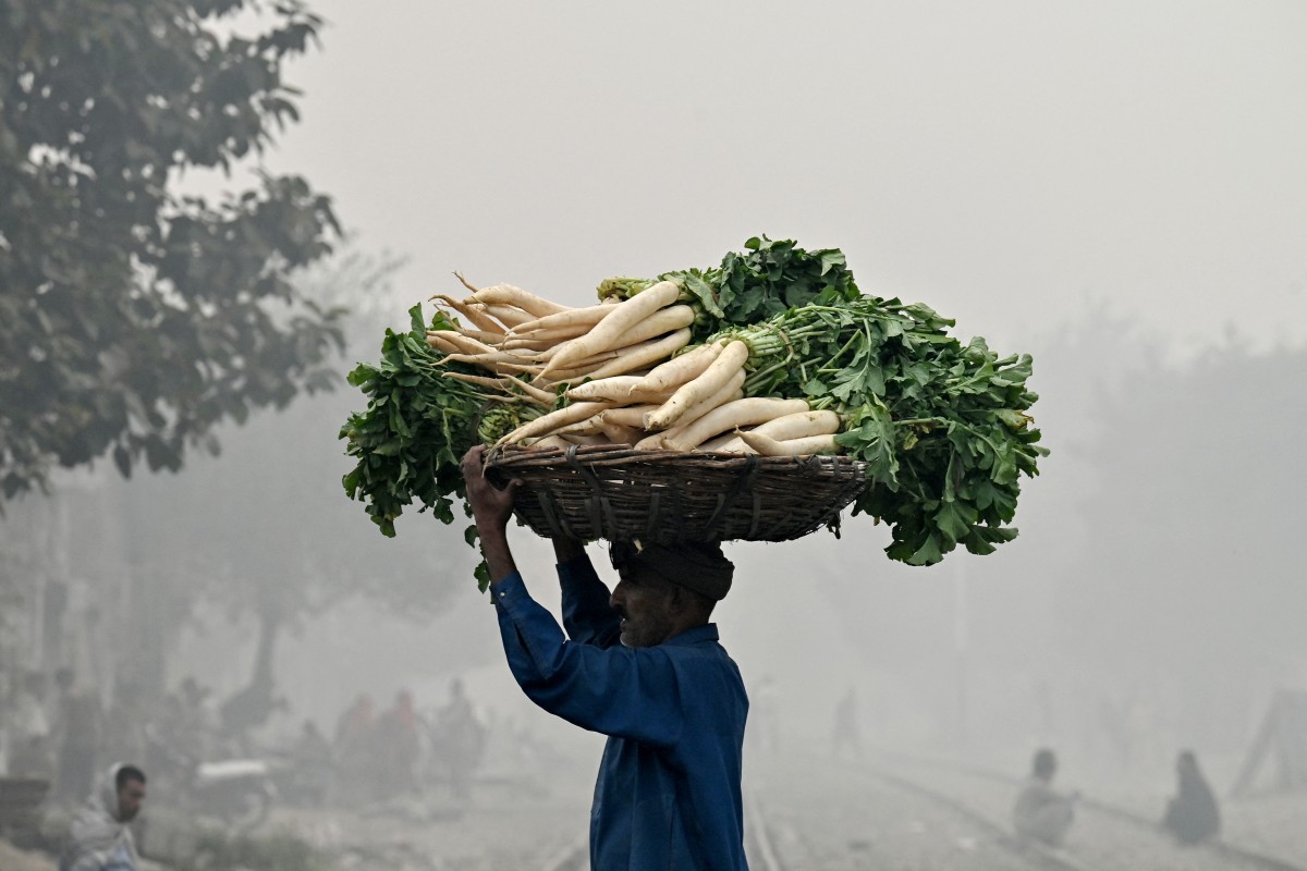 <p class="rteright">آٹھ نومبر 2024 کی اس تصویر میں لاہور میں ایک سبزی فروش سر پر مولیوں سے بھری ٹوکری لے جا رہا ہے جبکہ فضا میں سموگ پھیلی ہوئی ہے (اے ایف پی)</p>