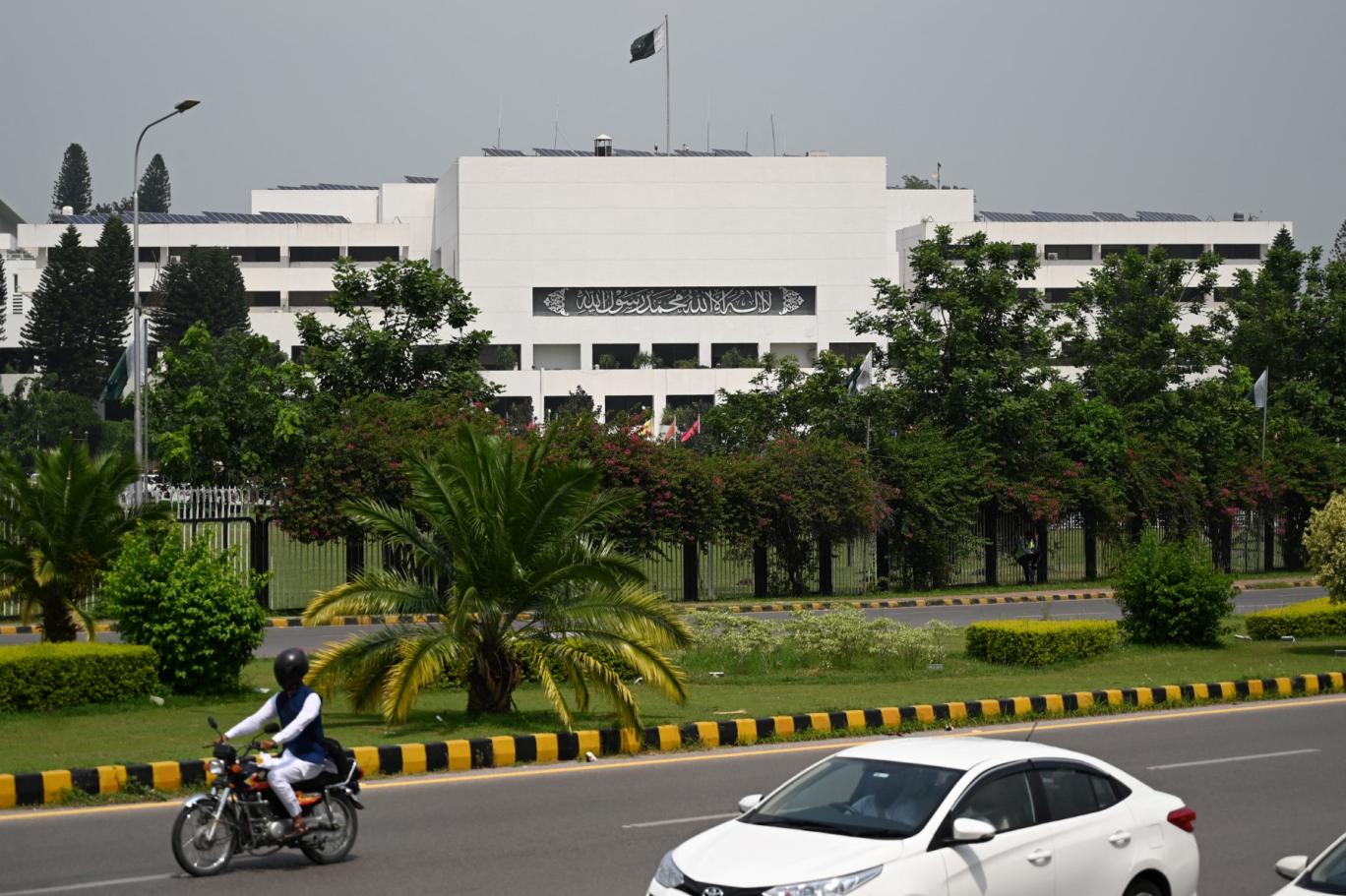 <p>اسلام آباد: 9 اگست، 2023 کو پارلیمنٹ ہاؤس کی عمارت کے سامنے سے مسافر گزرتے ہوئے (اے ایف پی)</p>