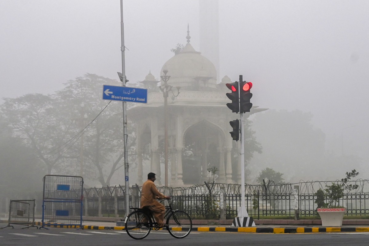 <p class="rteright">14 نومبر 2024 کی اس تصویر میں لاہور کی ایک سڑک پر ایک شخص سائیکل پر جا رہا ہے جبکہ فضا میں سموگ پھیلی ہوئی ہے (اے ایف پی)</p>