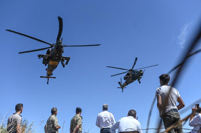 <p>آٹھ ستمبر، 2019 کو شام کی سرحد کے قریب ترک صوبے سانلیورفا میں امریکہ اور ترکی کی پہلی مشترکہ گشت کے دوران دو ترک ہیلی کاپٹر پرواز کر رہے ہیں (اے ایف پی)</p>
