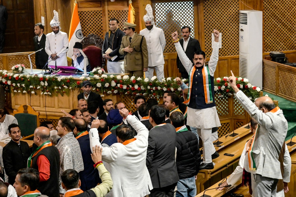 <p>آٹھ نومبر 2024 کو سری نگر میں اسمبلی اجلاس کے دوران انڈیا کے زیر انتظام کشمیر کی خصوصی حیثیت بحال کرنے کی قرارداد کے خلاف احتجاج کے دوران بھارتیہ جنتا پارٹی کے اراکین اسمبلی نعرے لگا رہے ہیں (توصیف مصطفیٰ/ اے ایف پی)</p>