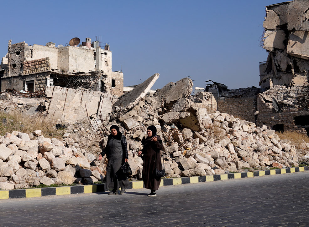 <p class="rteright">9 دسمبر، 2024 کو شام کے شہر حلب، میں خواتین تباہ شدہ عمارتوں کے پاس سے گزر رہی ہیں (روئٹرز/کرم المصری)</p>