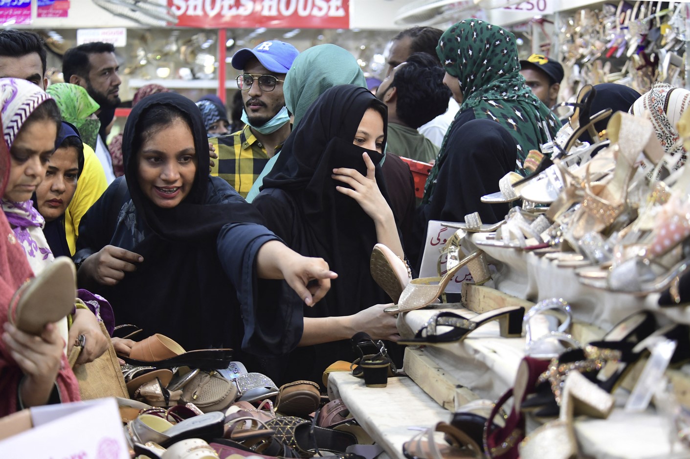 <p>19 اپریل 2023 کو کراچی میں خواتین خریداری کے دوران بازار میں جوتے دیکھ رہی ہیں (آصف حسن / اے ایف پی)</p>