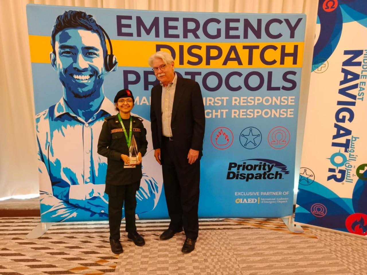 <p class="rteright">سندھ انٹیگریٹڈ ایمرجنسی اینڈ ہیلتھ سروسز کی خاتون آپریٹر روشان ریاض لغاری جنوری 2025 انٹرنیشنل اکیڈمی آف ایمرجنسی 911 کی جانب سے بحرین میں ’ڈسپیچر آف دی ایئر‘ کا ایوارڈ وصول کرتے ہوئے (روشان ریاض لغاری)</p>