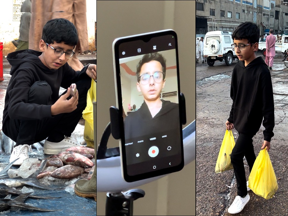 ایک اتوار کی صبح 12 سالہ حذیفہ خان کراچی کی فرنٹیئر کالونی کی تنگ گلیوں میں پورٹیبل مائیکرو فون تھامے اپنے والد کے ساتھ مچھلیوں سے بھری ریڑھی لے جا رہے تھے۔