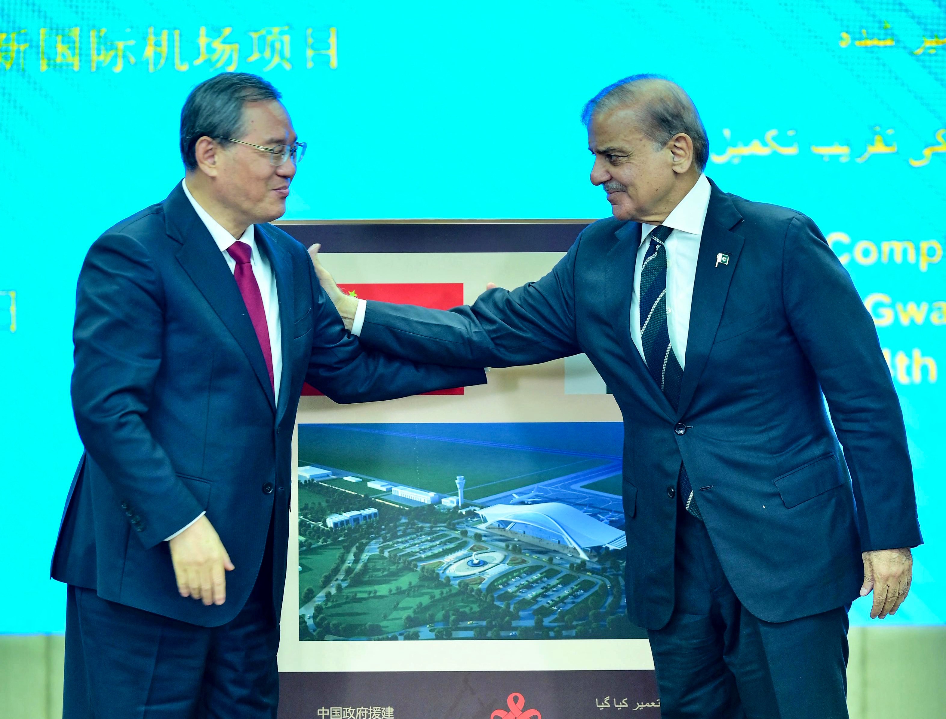 <p class="rteright">پاکستان کے وزیراعظم شہباز شریف اور چینی وزیراعظم لی کیانگ کی یہ تصویر 14 اکتوبر 2024 کو اسلام آباد میں نیو گوادر ایئرپورٹ کی افتتاحی تقریب کے موقعے پر لی گئی (فائل فوٹو/ اے ایف پی)</p>