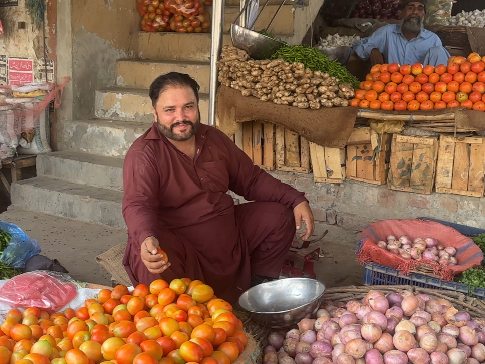 <p class="rteright">واہگہ بارڈر سے پانچ، چھ کلومیٹر دور واقع لاہور کے قصبے باٹا پور میں ایک سبزی فروش اپنا سٹال لگائے بیٹھا ہے (ارشد چوہدری/ انڈپینڈنٹ اردو)</p>