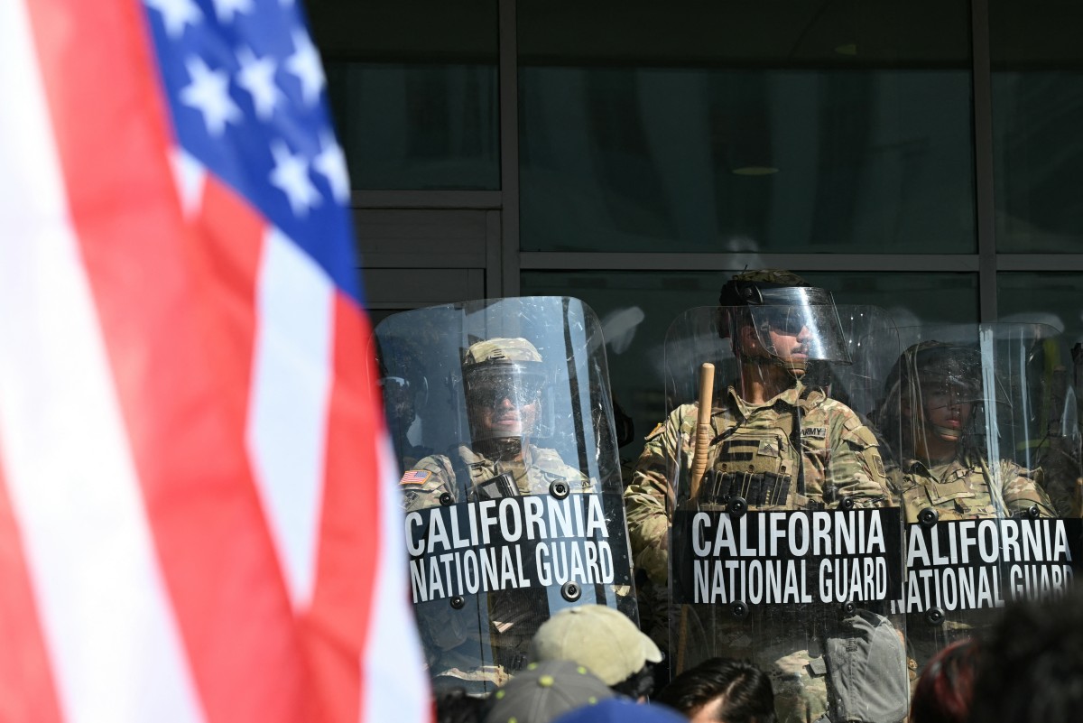 <p class="rteright">9 جون 2025 کو لاس اینجلس میں امیگریشن کے خلاف احتجاج کے دوران امریکی پرچم کے سامنے چوکس کھڑے نیشنل گارڈز (اے ایف پی)</p>