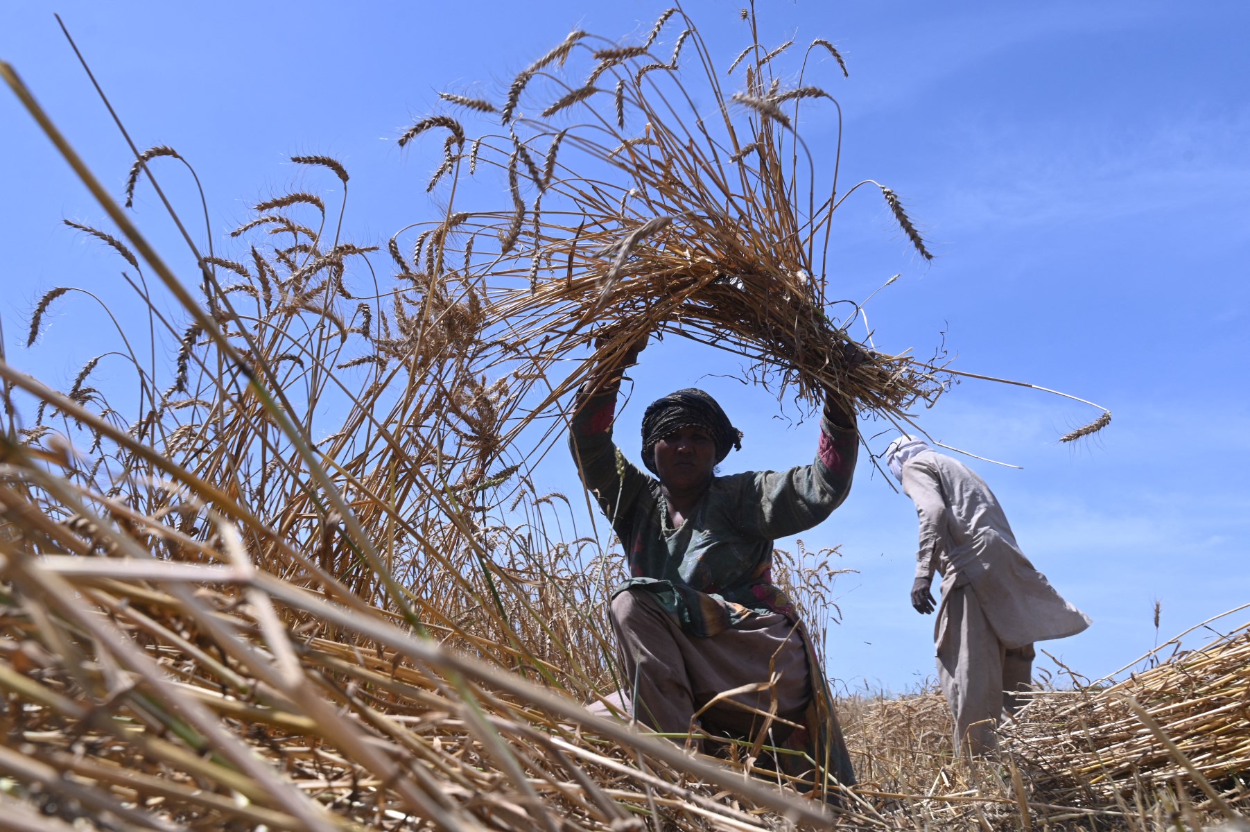 <p>17 اپریل 2024 کو لاہور کے مضافات میں کسان گندم کے کھیت میں کٹائی کر رہے ہیں (عارف علی / اے ایف پی)</p>