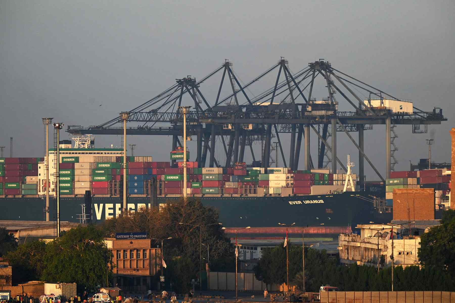 <p>چھ اپریل، 2023 کو کراچی کی بندرگاہ پر موجود جہاز پر شپنگ کنٹینرز نظر آ رہے ہیں (اے ایف پی)</p>