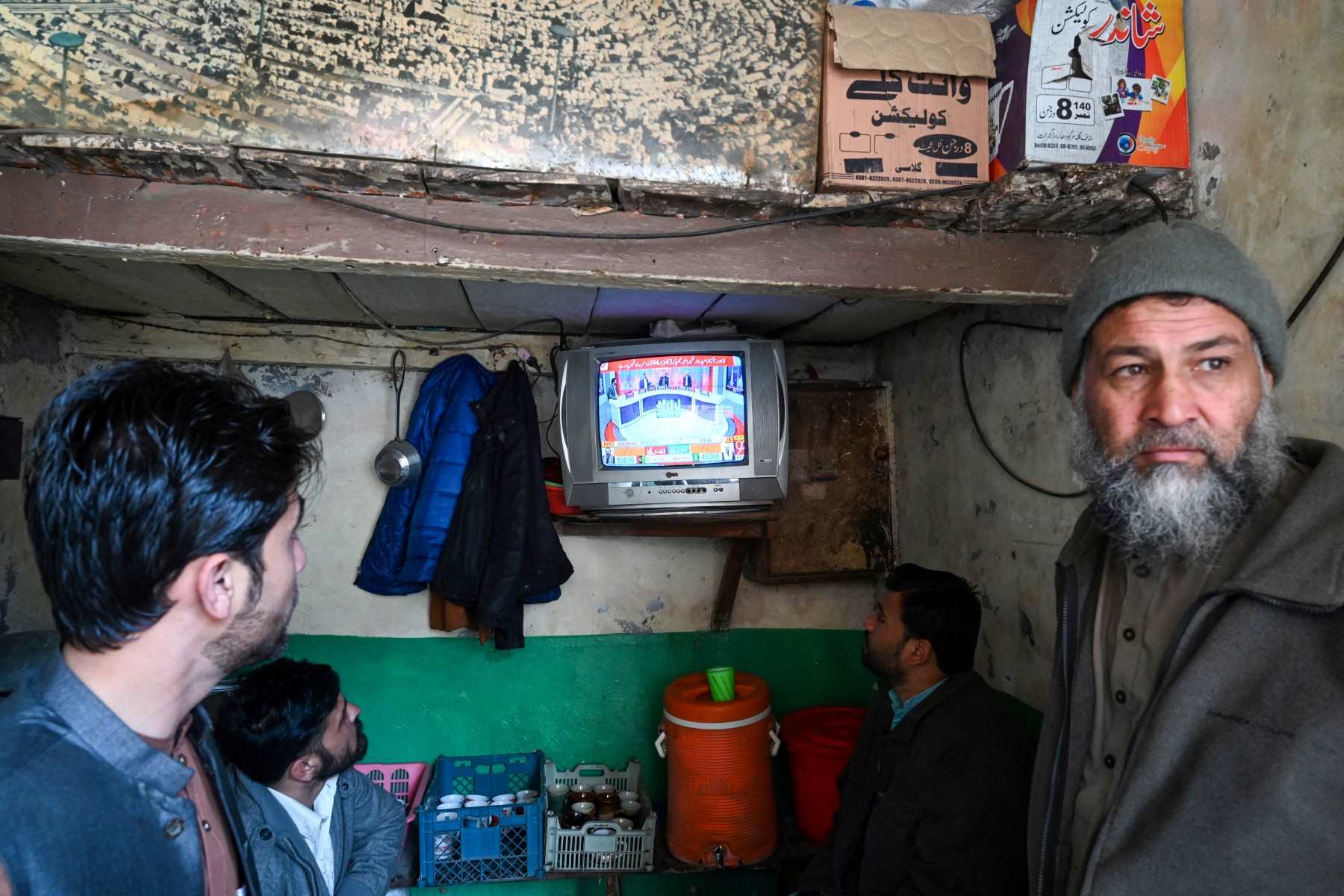 <p>پاکستان کے قومی انتخابات کے ایک روز بعد نو فروری، 2024 کو لاہور میں ایک چائے خانے پر لوگ ٹیلی وژن پر براہِ راست انتخابی نتائج دیکھ رہے ہیں (اے ایف پی)</p>