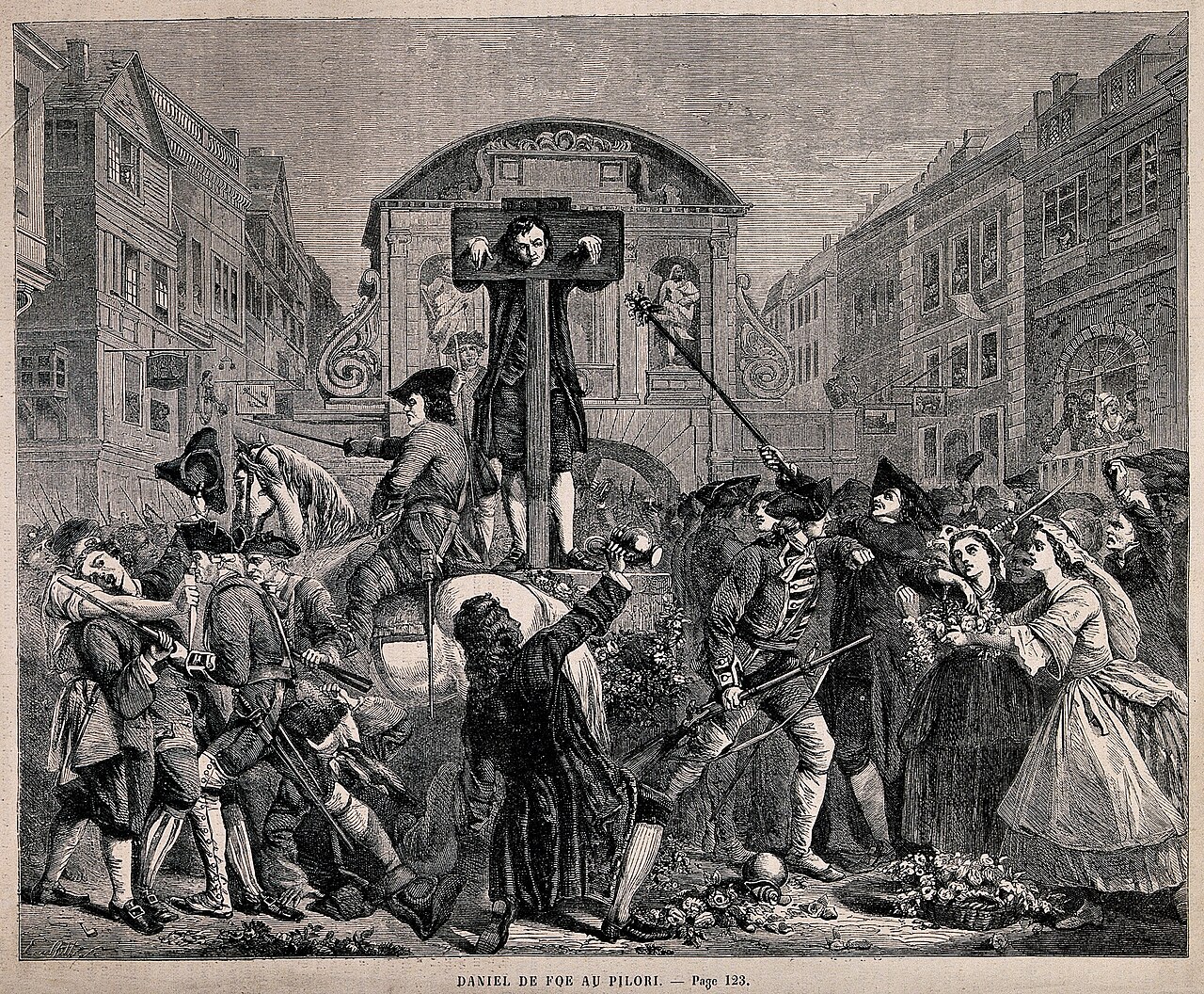 <p>1703 میں مصنف ڈینیئل ڈیفو کو ریاست کے خلاف بغاوت پر مبنی تحریر (سیدیٹیئس لائبل) کے جرم میں عوامی سزا (پِلوری) دی جا رہی ہے (وکی پیڈیا کامنز)</p>
