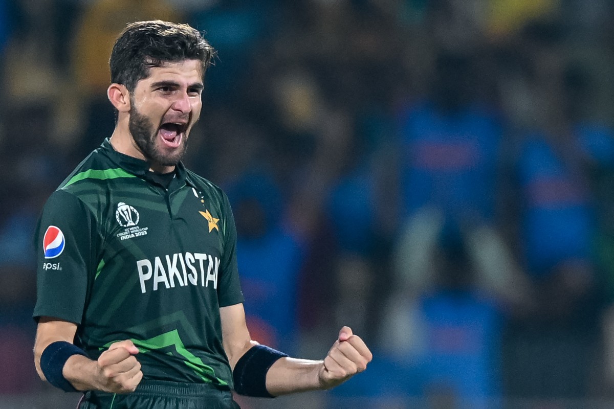 <p>شاہین شاہ آفریدی 23 اکتوبر، 2023 کو چنئی میں آئی سی سی مینز کرکٹ ورلڈ کپ 2023 کے میچ میں افغان بیٹر کی وکٹ لینے کے بعد جشن منا رہے ہیں (اے ایف پی)</p>