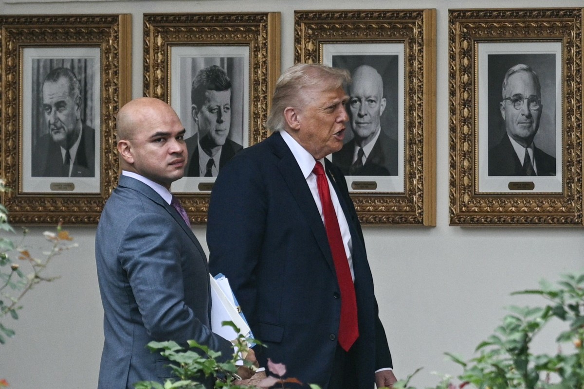 <p class="rteright">امریکی صدر ڈونلڈ ٹرمپ 30 ستمبر 2025 کو وائٹ ہاؤس واپس لوٹتے ہوئے اوول آفس آپریشنز کے ڈائریکٹر والٹ ناؤٹا (بائیں) کے ساتھ راہداری میں سابق امریکی صدور کی تصاویر کے پاس سے گزر رہے ہیں (برینڈن سمیالووسکی / اے ایف پی)</p>