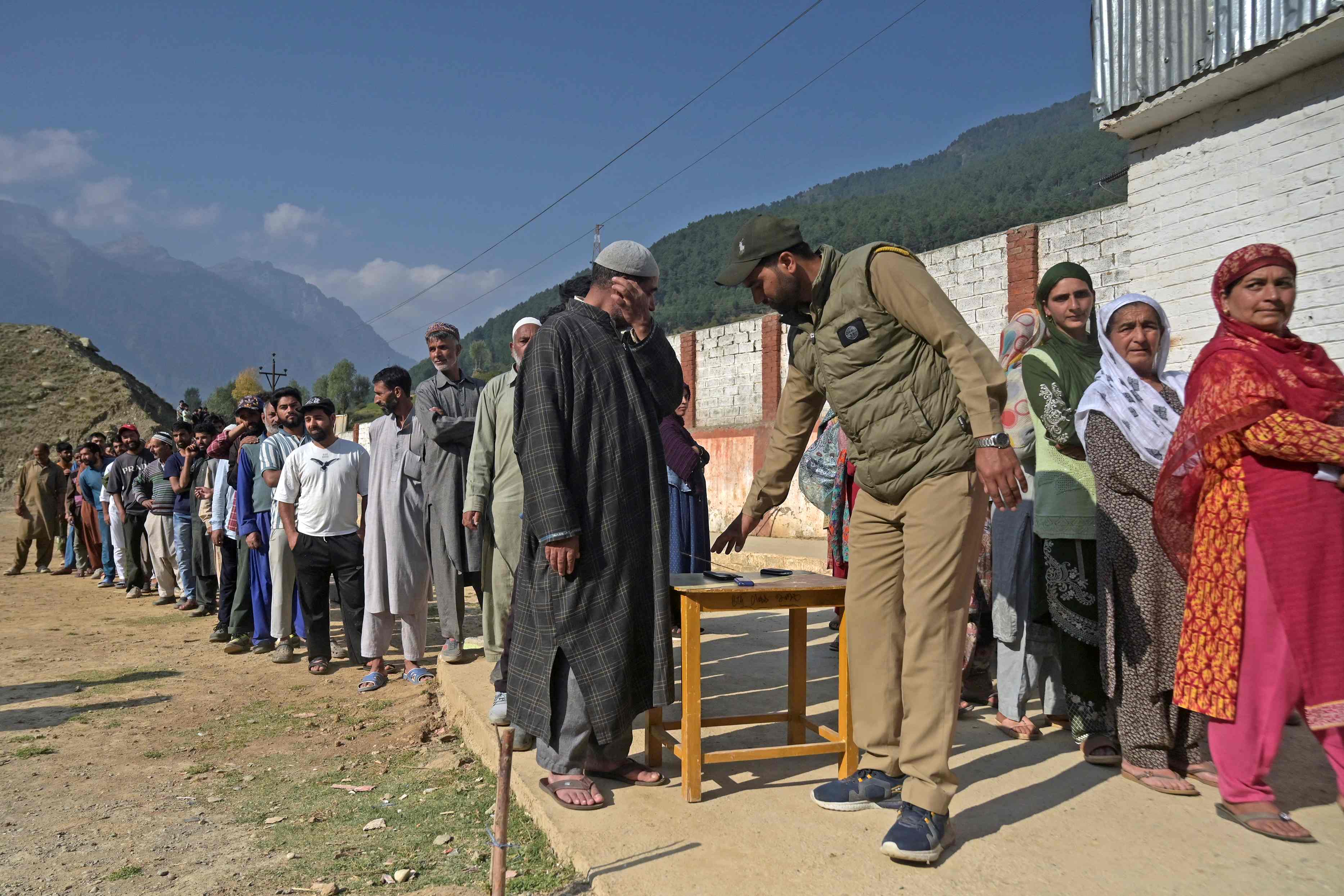 <p>گاندر بل میں 25 ستمبر، 2024 کو مقامی اسمبلی کے انتخابات کے دوسرے مرحلے کے دوران ایک پولنگ سٹیشن کے باہر ووٹروں کی قطار نظر آ رہی ہے (اے ایف پی)</p>