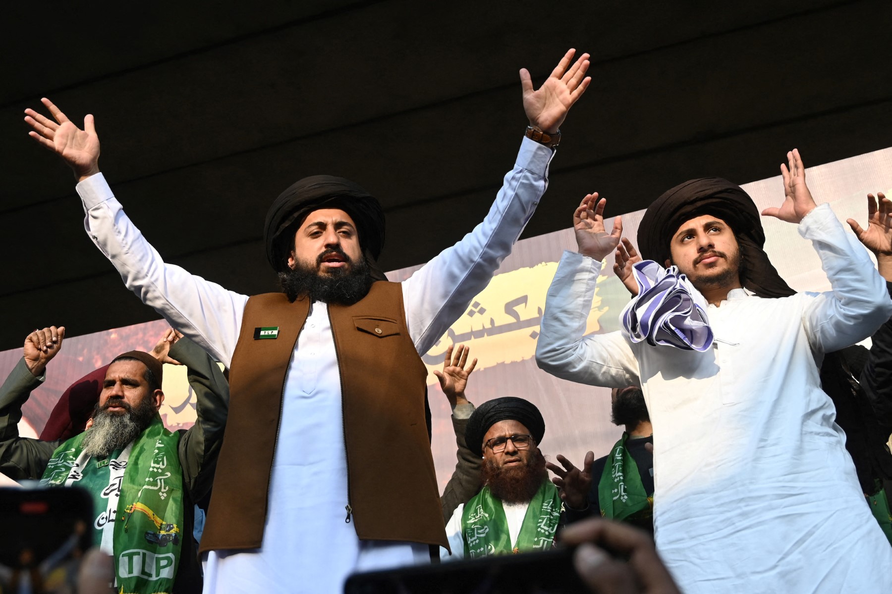 <p class="rteright">کالعدم تحریک لبیک پاکستان کے رہنما سعد رضوی (بائیں) اور ان کے چھوٹے بھائی انس رضوی (بائیں) 10 فروری 2024 کو لاہور میں ایک احتجاج کے دوران حامیوں کے نعروں کا جواب دے رہے ہیں (عامر قریشی/ اے ایف پی)</p>