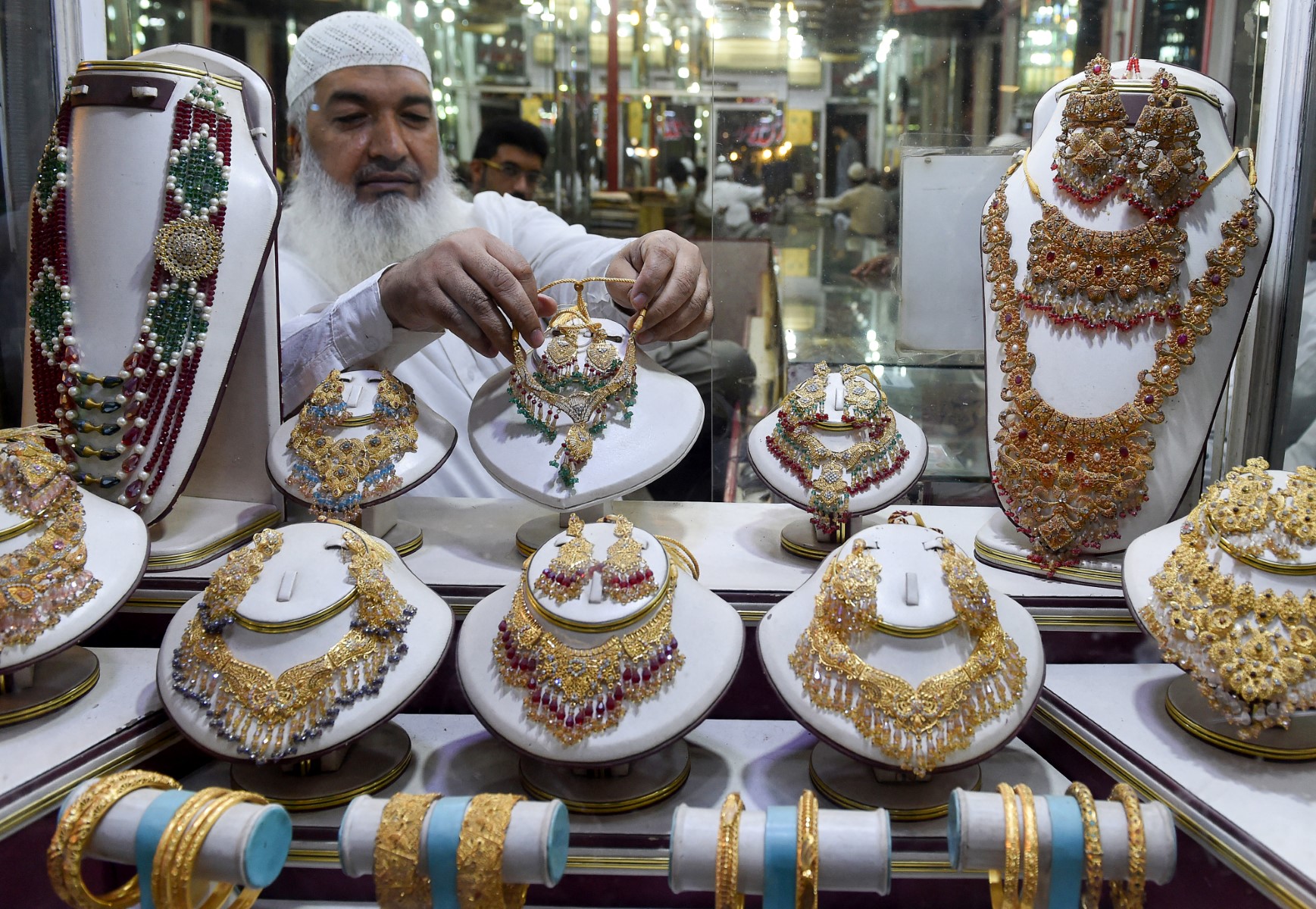 <p>ایک پاکستانی تاجر 11 اکتوبر 2018 کو لاہور میں اپنے سونے کی دکان پر زیورات کی نمائش کر رہا ہے (عارف علی/ اے ایف پی)</p>