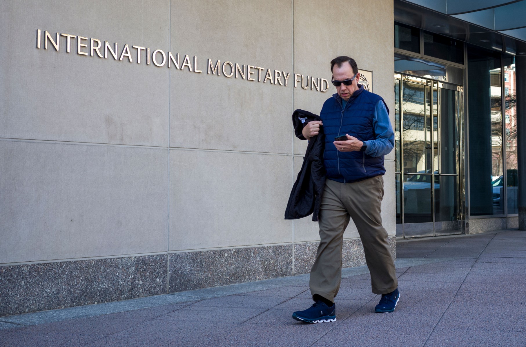 <p>11 مارچ 2022 کو واشنگٹن ڈی سی میں انٹرنیشنل مانیٹری فنڈ کے ہیڈ کوارٹر کی عمارت کے باہر گزرتے ہوا ایک آدمی اپنا موبائل فون استعمال کر رہا ہے (اے ایف پی)</p>