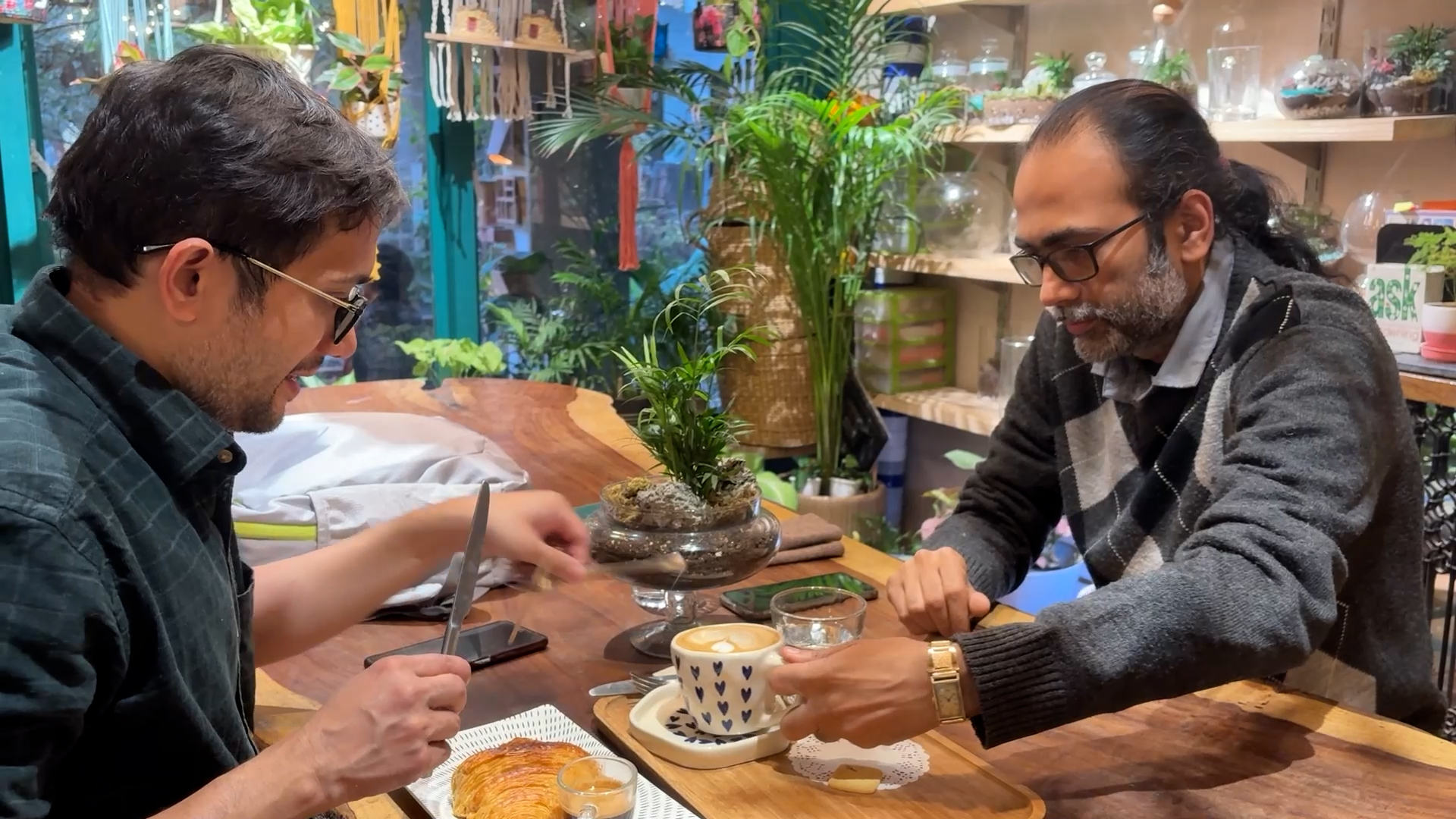 پہلی نظر میں یہ کیفے کسی گرین ہاؤس جیسا لگتا ہے، کیفے کے چاروں طرف زرد روشنی میں نہایا سبزہ نظر آتا ہے، پلانٹ ہینگرز میزوں کے اوپر آہستہ سے جھولتے دکھائی دیتے ہیں، اندرونی حصے میں قطار در قطار پودے سجے ہیں اور ان کے درمیان کچھ ٹیبل او کرسیاں ہیں۔