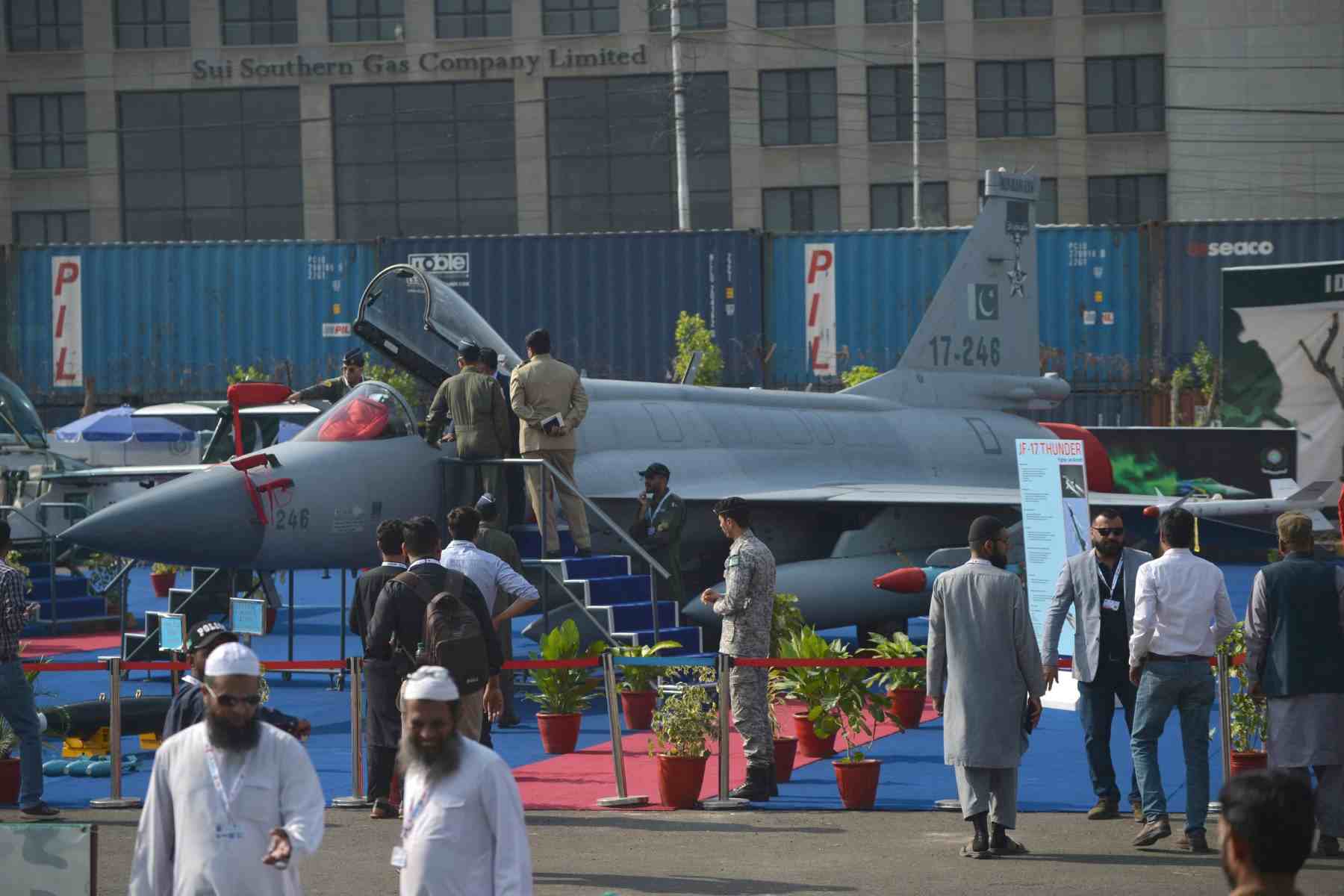 <p>16 نومبر 2022 کو کراچی کے ایکسپو سینٹر میں منعقدہ آئیڈیاز نمائش میں عسکری حکام پاکستان کے جے ایف 17 تھنڈر طیارے کا جائزہ لے رہے ہیں (اے ایف پی)</p>