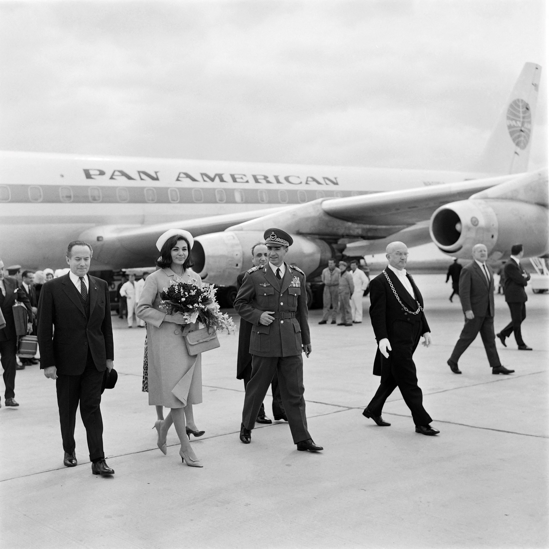 <p>ایران کے شاہ محمد رضا پہلوی اور ملکہ فرح دیبا 10 اپریل 1962 کو اورلی ایئرپورٹ پر پان امریکن پرواز سے امریکہ کے سرکاری دورے کے راستے میں قیام کے لیے رکے (اے ایف پی)</p>