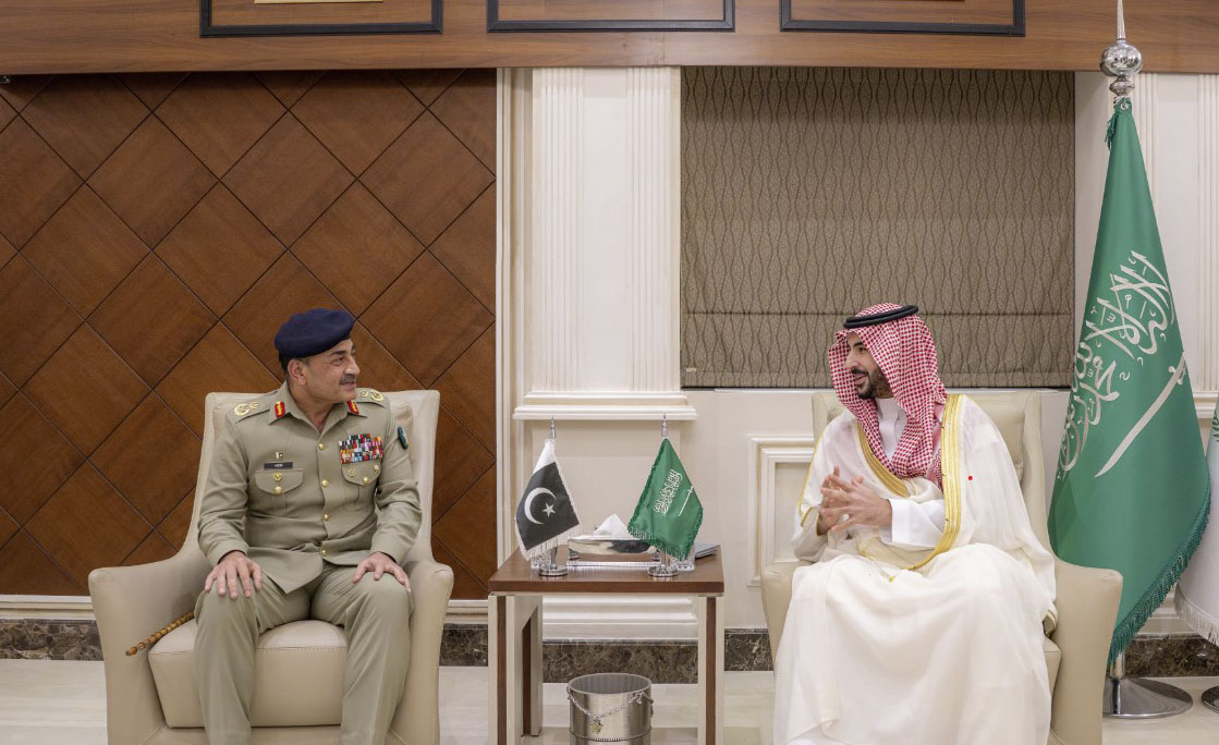 ہفتے کو ایکس پر اپنے پیغام میں سعودی وزیر دفاع نے لکھا کہ پاکستانی آرمی چیف اور چیف آف ڈیفنس فورسز فیلڈ مارشل عاصم منیر سے ملاقات میں ’دونوں ممالک کے درمیان مشترکہ سٹریٹجک دفاعی تعاون کے معاہدے کے دائرہ کار میں مملکت پر ایران کی جانب سے ہونے والے حملوں اور ان سے نمٹنے کے ممکنہ طریقۂ کار پر تفصیلی تبادلۂ خیال کیا گیا۔‘