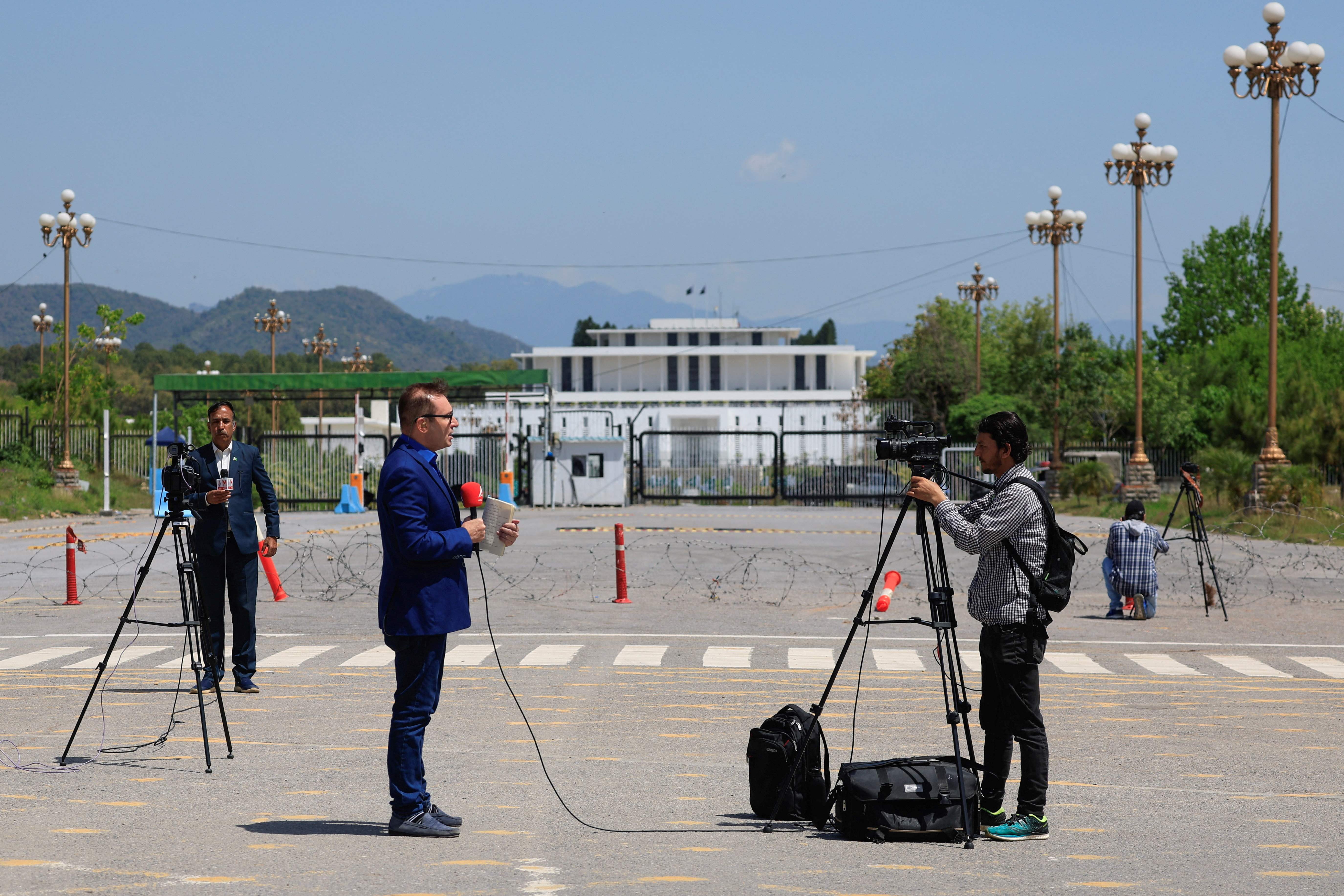 <p>اسلام آباد میں چند صحافی 10 اپریل 2026 کو امریکہ ایران مذاکرات سے قبل پارلیمان کے سامنے موجود ہیں (فائل فوٹو/ روئٹرز)</p>